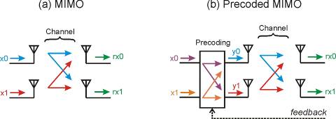 圖 1. 簡(jiǎn)化方框圖顯示了(a)未采用預(yù)編碼的 MIMO 與(b)采用預(yù)編碼的 MIMO 之間的差別