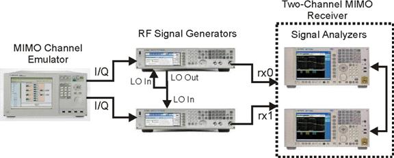 在各種信道條件下檢測(cè)預(yù)編碼和 MIMO 的工作性能時(shí),需要有各種必要的測(cè)量工具。圖 2 顯示了典型的 2x2 MIMO 測(cè)量設(shè)置,它由無(wú)線信道仿真器、信號(hào)源和信號(hào)分析儀組成。信道仿真器(例如 Agilent N5106 PXB 接收機(jī)測(cè)試儀)用于創(chuàng)建真實(shí)的多信道、多路徑環(huán)境(包括天線和空間相關(guān)的影響)[3]。某些商用仿真器具有內(nèi)置基帶發(fā)生器,通過(guò)在軟件工具(例如 Agilent Signal Studio、Agilent ADS 和 Agilent SystemVue) 中開(kāi)發(fā)的標(biāo)準(zhǔn)模型或定制模型,可生成復(fù)雜的波形。信道仿真器輸出復(fù)雜的基帶波形,代表預(yù)編碼 MIMO 信號(hào)已被多路徑、噪聲和/或干擾所修改。之后,這些基帶波形將使用許多射頻矢量信號(hào)發(fā)生器提供的模擬同相(I)和正交相位(Q)輸入,調(diào)制到射頻載波上;鶐(shù)據(jù)也可通過(guò)信號(hào)發(fā)生器(例如 Agilent MXG 系列)的數(shù)字 I 和 Q 輸入調(diào)制到射頻載波上。這是首選方案,因?yàn)檫@種方案可提供較佳性能,并且能夠執(zhí)行系統(tǒng)的自動(dòng)功率校準(zhǔn)。在圖 2 所示的測(cè)量系統(tǒng)中,兩個(gè)射頻信號(hào)發(fā)生器就是雙信道 MIMO 接收機(jī)的輸入。請(qǐng)注意,使用多個(gè)信號(hào)發(fā)生器仿真 MIMO 系統(tǒng)時(shí),雖然不要求對(duì)設(shè)備進(jìn)行鎖相,但在測(cè)試過(guò)程中,各個(gè)發(fā)生器之間需要有一個(gè)穩(wěn)定的相位關(guān)系,這是十分重要的。術(shù)語(yǔ)“鎖相”通常被稱(chēng)為“相位相干性”,它表示在特定載波頻率上工作的兩個(gè)或多個(gè)信號(hào)發(fā)生器的射頻輸出間的固定相位關(guān)系。由于每個(gè)數(shù)據(jù)層的信號(hào)在進(jìn)行傳輸之前都要根據(jù)已知的信道條件添加一個(gè)矢量,因此正確的相位關(guān)系對(duì)預(yù)編碼操作十分重要。如果用來(lái)仿真多個(gè)發(fā)射機(jī)的信號(hào)發(fā)生器有一個(gè)未知和/或隨時(shí)間變化的相位關(guān)系,接收到的信號(hào)就可能出現(xiàn)不希望的相位偏置,從而導(dǎo)致一個(gè)或多個(gè)恢復(fù)數(shù)據(jù)流的性能降低。本文在后面將會(huì)提供一個(gè)實(shí)例,說(shuō)明信號(hào)發(fā)生器相位偏置與系統(tǒng)性能的關(guān)系。在使用兩個(gè)現(xiàn)代射頻信號(hào)源(例如 Agilent MXG 信號(hào)發(fā)生器)的測(cè)試系統(tǒng)中,兩臺(tái)發(fā)生器將通過(guò)共享一臺(tái)發(fā)生器的未調(diào)制的本地振蕩器(LO)來(lái)保持相位相干性(參見(jiàn)圖 2)。在某些具有多個(gè)射頻信號(hào)發(fā)生器(例如 4x4 和 2x4 配置)的測(cè)試系統(tǒng)中,推薦使用單獨(dú)的射頻信號(hào)發(fā)生器作為主本地振蕩器,以便為信號(hào)發(fā)生器的本地振蕩器輸入提供足夠的驅(qū)動(dòng)電平。