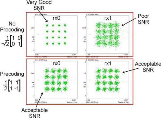 使用 LTE 預(yù)編碼實(shí)現(xiàn)潛在系統(tǒng)改進(jìn)的測(cè)量實(shí)例現(xiàn)在將通過(guò)上面介紹的基本 2x2 MIMO 系統(tǒng)來(lái)演示。信道仿真器經(jīng)過(guò)配置可生成一個(gè)“靜態(tài)”的多路徑信道,從而造成一個(gè)接收信號(hào)具有高 SINR,另一個(gè)接收機(jī)信號(hào)具有低 SINR。圖3 顯示了采用(下圖)和未采用(上圖)預(yù)編碼的雙信道 MIMO 信號(hào)進(jìn)行恢復(fù)后所測(cè)得的星座圖。對(duì)于未采用預(yù)編碼的測(cè)量(參考了 LTE 標(biāo)準(zhǔn)中的碼簿索引 0),數(shù)據(jù)層直接映射到兩個(gè)發(fā)射天線,并通過(guò)仿真的多路徑信道進(jìn)行發(fā)射,這就使接收到的第一個(gè)信號(hào) rx0 具有相對(duì)較高的 SINR,而接收到的第二個(gè)信號(hào) rx1,則受到了嚴(yán)重的衰減,具有很低的 SINR。第二個(gè)信號(hào)的質(zhì)量及這兩個(gè)信號(hào)間巨大的 SINR 差別使正確解碼這個(gè)兩信道 MIMO 信號(hào)變得非常困難。在本例中,當(dāng)使用預(yù)編碼時(shí),通過(guò)碼簿索引 1,較差的信道條件所帶來(lái)的負(fù)面效應(yīng)可在一定程度上消除,因?yàn)轭A(yù)編碼將試圖均衡在每個(gè)接收機(jī)上測(cè)得的 SINR。從這個(gè)測(cè)量實(shí)例的結(jié)果可以看出,較差質(zhì)量的信號(hào) rx1 的 SINR 得到了改進(jìn),另一個(gè)信號(hào) rx0 的 SINR 雖然有所降低,但仍在可接受的范圍內(nèi)。通過(guò)對(duì)兩個(gè)接收信道進(jìn)行適當(dāng)?shù)鼐猓琈IMO 接收機(jī)能夠輕松恢復(fù)正交發(fā)射信號(hào)。