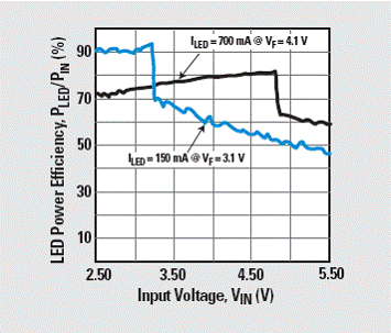 使用白光 LED 的一個難題在于如何使用輸入電壓寬泛的電池為其供電。白光 LED 的正向電壓范圍介于 3.2V~4.8V 之間,這一范圍恰好處于大多數電池輸入電壓范圍的中間位置,也就是說轉換器應該具有升壓或降壓能力,以保持 LED具有合適的正向電壓。