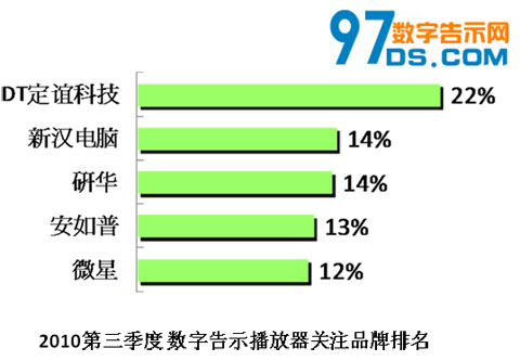 近日「97數字告示網」公布2010年第三季度國內數字告示播放器關注品牌排名結果,其問卷調查的受眾數量達數千名業內外人士。安如普超媒體播放器HMP100在“數字告示播放器關注品牌”單元的調查結果中,位列第四,并打敗眾多立足中國市場多年的知名品牌。