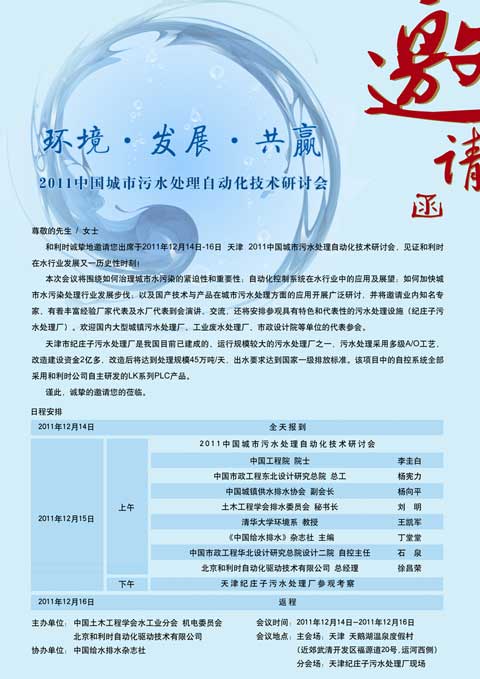 為加強同市政工程行業(yè)的技術交流與合作,促進和利時水處理解決方案在行業(yè)中的應用推廣,作為國內(nèi)第一家專業(yè)研發(fā)制造大中型分布式控制系統(tǒng)(DCS)和可編程控制器(PLC)的企業(yè)和利時公司宣布將于12月14日---16日在天津召開“2011中國城市污水處理自動化技術研討會”。本次會議由中國土木工程學會水工業(yè)分會機電委員會與和利時公司共同舉辦,《中國給水排水》雜志社協(xié)辦。