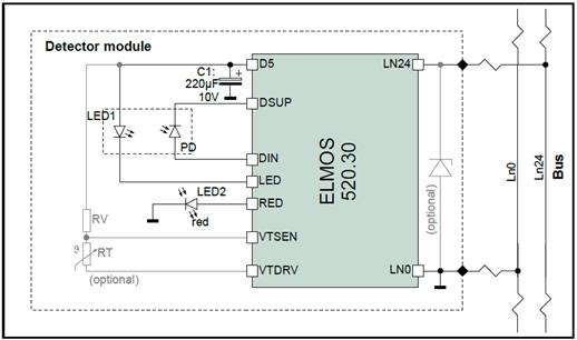德國elmos公司日前宣布推出基于光電式的煙霧探測器方案E520.30,它具有硬件連線總線接口(“聯網式煙霧探測器”)。該IC可用于實現可編程煙霧探測器平臺,具有大電流驅動器,可驅動紅外LED和與之匹配的光學信號測量放大器。