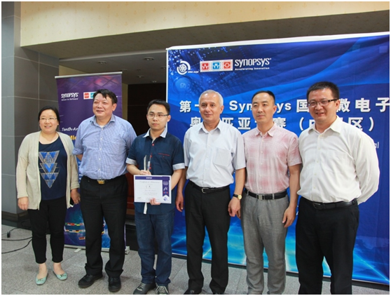 本屆中國區競賽組委會成員中科院微電子所所長、中科院EDA中心理事長葉甜春,中國科學院EDA中心主任陳嵐,Synopsys亞美尼亞教育部總監、競賽全球組委會主席Vazgen Melikyan博士,中科院微電子所人教處處長王雷,Synopsys中國區副總經理李鶴,與本屆中國區競賽的冠軍選手——來自東南大學的微電子學與固體電子學研究生丁杰合影。丁杰同學將代表中國選手出征今年10月在亞美尼亞舉行的決賽,屆時,各國頂級選手將面臨完成復雜工程任務的巨大挑戰。本屆競賽共計8位選手獲得中國區獎項。