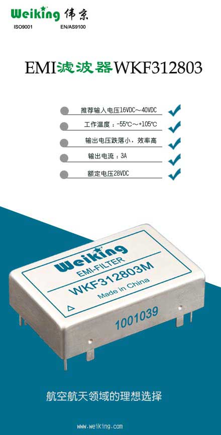 Weiking特推出EMI 濾波器WKF312803, 是為減小DC-DC 變換器在電源線的高頻噪聲而專門設計,WKF312803 濾波器與偉京電子WK3128XXX 50W 以內DC-DC 變換器配套使用,可使電源線上的噪聲傳導極限符合GJB151 之CE102 的要求。