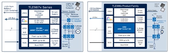 Cortex M3處理器,其外設(shè)集包含電流傳感器、與捕獲和比較單元(CAPCOM6)同步、可實(shí)現(xiàn)脈寬調(diào)制(PWM)控制的逐次逼近型10位ADC,以及16位定時(shí)器。此外還集成了LIN收發(fā)器,以便與器件及眾多通用I/O通信。支持通過(guò)LIN收發(fā)器,進(jìn)行快速編程。這兩個(gè)系列產(chǎn)品均具備片上線性穩(wěn)壓器,可為外接負(fù)載供電。它們的閃存容量從36kB到128kB不等。工作電壓輸入范圍為5.4V至28V。集成式電荷泵可實(shí)現(xiàn)低壓運(yùn)行和可編程電流,以及已獲得專利的電流斜率控制,可為各種類型的MOSFET提供優(yōu)化EMC性能,而這僅需使用兩個(gè)外接電容器。這樣一來(lái),比之常見自舉升壓技術(shù),大大節(jié)省了物料成本。TLE987x和TLE986x都能承受較高40V的負(fù)載突降,同時(shí)維持低至3.0V的擴(kuò)展電源電壓范圍,在此條件下,單片機(jī)和閃存仍可保持完全正常功能。