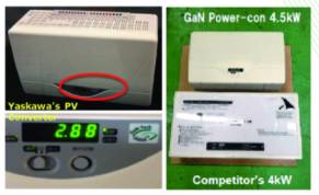 •Transphorm氮化鎵(GaN)器件:會上展示的GaN HEMT結構實現了創新,其GaN模塊可實現一半尺寸的PV逆變器,功耗減少超過40%,擊敗了硅和碳化硅。其輸出功率為4.5kW(單相200V),輸入電壓60-400V;較大功效超過98%,而硅基產品僅為不到96.5%;其體積約為10L,約為硅基產品的一半,因此電感器和電容器更小,散熱器、PCB、外殼也更小。展示的產品包括Yaskawa