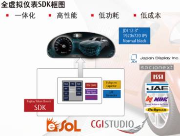 •Socionext汽車圖形顯示控制器:全虛擬儀表SDK是一款一體化、高性能、低功耗和低成本的解決方案。這款3D全虛擬儀表解決方案的主芯片Triton-C是3D全虛擬儀表專用圖形處理器,還采用了全球獨有的IRIS-MDP強大2D引擎;多達8層的多層顯示和6路視頻輸入,3路獨立輸出;具有專為儀表設計的圖形安全功能;超低功耗,低整機成本,具有完整的軟硬件開發平臺并可以縮短開發周期。另一個解決方案是全球首家量產的成熟360度3D全景方案,支持標清、高清、完整的工具鏈,并具有ADAS擴展能力。