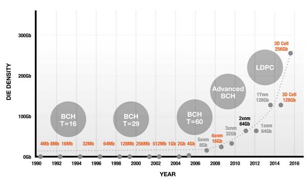 新的3D堆棧與三層式儲存(TLC)設計架構,讓NAND Flash芯片容量密度激增、成本下滑。但也因此,SSD主控的糾錯修正技術就顯得更加重要,特別是在3D NAND更復雜的架構下,需要高效率的糾錯修正技術,才可以確保SSD的穩定度,并且也能同時提升SSD壽命及效能。
