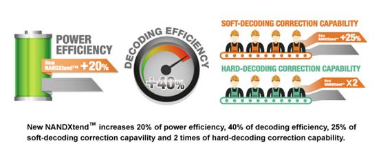 圖:較新NANDXtend技術(shù),可以提高20%的電力效能、40%的解碼效率、25%的軟解碼校正能力、以及2倍的硬解碼校正效能。