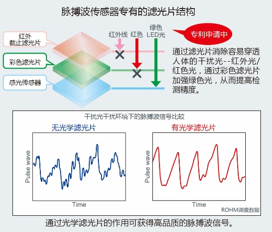 “BH1790GLC”利用ROHM的傳感器技術(shù)優(yōu)勢,采用非常適合脈搏檢測的符合綠色光波長的光電二極管,同時(shí)感光部采用綠色光的濾光片和紅外(IR)截止濾光片相結(jié)合的脈搏傳感器專有的濾光片結(jié)構(gòu)。因此,