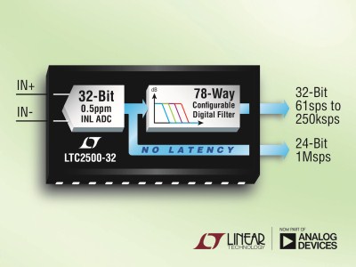 加利福尼亞州米爾皮塔斯 (MILPITAS, CA) 和馬薩諸塞州諾伍德 (NORWOOD, MA) – 不久前收購了凌力爾特公司 (Linear Technology Corporation) 的亞德諾半導體 (Analog Devices, Inc.,簡稱ADI) 宣布推出LTC2500-32,這是一款超高精確度的 32 位逐次逼近寄存器型 (SAR) 模數轉換器 (ADC)。LTC2500-32 是一種面向精準測量應用的新型和可行方法,該器件把凌力爾特專有 SAR ADC 架構的高準確度和速度與靈活的集成化數字濾波器相整合,以優化系統信號帶寬并放寬模擬抗混疊濾波器要求。LTC2500-32 同時提供兩個輸出:(1) 一個經過數字濾波的 32 位低噪聲輸出,該輸出實現了高達 148dB 的動態范圍;(2) 一個 32 位 1Msps 無延遲輸出,該輸出由一個超范圍檢測位、一個表示輸入電壓差的 24 位代碼和一個表示共模輸入電壓的 7 位代碼組成。無延遲輸出在本質上與數字濾波輸出是完美匹配的,從而在那些需要使用一個附加較快速的 ADC與一個精準 ADC 并行以監視信號完整性的應用中,消除了常見的失配和漂移問題。寬輸入共模范圍和高 CMRR 使 LTC2500-32 能夠連接共模電壓不斷變化的信號,從而簡化了模擬信號鏈。兩個輸出每個都可高度準確地表示加在兩個輸入端子之間的電壓差。
