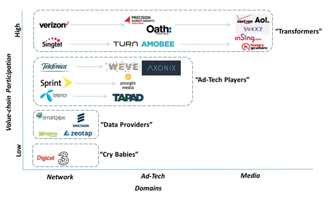 Strategy Analytics無線媒體服務戰略總監Nitesh Patel表示,“根據運營商在廣告和媒體中的參與程度,我們總結了運營商進行移動廣告的方式。SingTel和Verizon是‘變革者’——大幅度的擴張網絡、廣告技術以及媒體領域,而“廣告技術玩家”比如Telefonica、Sprint和Telenor選擇聚焦廣告技術。愛立信和Smartpipe讓運營商成為被動的‘數據提供者’,而鑒于Digicel和Three反廣告的定位,我們把他們稱之為‘哭鬧的嬰兒’。”