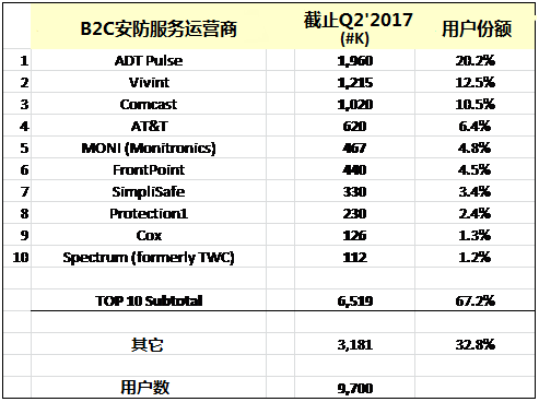 圖表1: 美國(guó)互動(dòng)安防服務(wù)運(yùn)營(yíng)商排名,按用戶數(shù)劃分(截止Q2’2017)