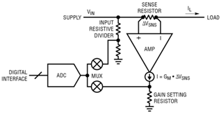 要監視電子系統的功耗,就需要連續測量電流和電壓。電壓可以直接用模數轉換器 (ADC) 測量。如果 ADC 輸入范圍小于所監視的電壓,那么也許需要一個電阻分壓器 (圖 1)。為了測量電流,需要在電源通路中放置一個檢測電阻器,再測量其壓降。如圖 1 所示,跨導放大器將高壓側檢測電壓轉換成電流輸出,該電流流經增益設定電阻器,以產生一個以地為基準并與負載電流成比例以及適合饋送給 ADC 的電壓。為了較大限度降低功耗,全標度檢測電壓限制為幾十毫伏。因此,放大器輸入失調需要低于100μV。為了計算功率,必須使用通過 ADC 數字接口訪問 ADC 數據的微控制器或處理器,以實現電壓讀數和電流讀數相乘。要監視能耗,需要在一定時間內累計 (相加) 功率讀數。