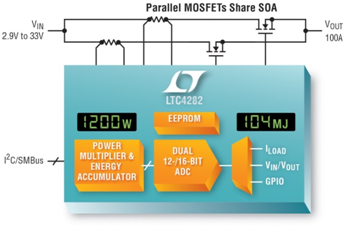 LTC4282 是一款可熱插拔的控制器和電路斷路器,提供能量遙測功能和 EEPROM (圖 3),憑借創新性雙電流通路特色,滿足了大電流應用的需求。該控制器通過控制外部 N 溝道 MOSFET,可平滑地給大容量電容器加電,從而避免出現輸入電源干擾以及電流達到破壞性水平,因此可確保電源在 2.9V 至 33V 范圍內安全接通和斷開。LTC4282 位于通往電路板電源的入口,其準確度為 0.7% 的 12 位或 16 位 ADC 通過一個I2C/SMBus數字接口報告電路板電壓、電流、功率和能耗。內部 EEPROM 為寄存器設置和故障記錄數據提供非易失性存儲,從而可在開發過程中及現場運行時,加速調試和故障分析。