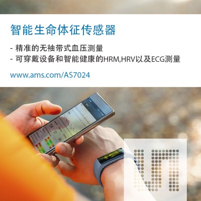 艾邁斯半導體顏色和光譜傳感執行副總裁Thomas Riener表示:“AS7024參考設計及其血壓測量算法在個人健康監測技術領域取得了重大突破。使用了AS7024的智能可穿戴設備能夠提供全天候血壓測量,并且對很多用例來說,它足夠準確、可靠。這也將顯著改善用戶體驗,使其擺脫定期袖帶式測量所帶來的不便與不適,為之提供實際環境條件中血壓、心率和心臟活動的連續測量。”