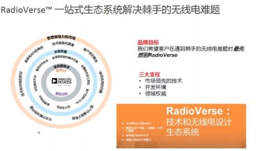 客戶在遇到棘手的無線難題時(shí)較先想到RadioVerse,這是此一站式生態(tài)系統(tǒng)的品牌目標(biāo)。這個(gè)系統(tǒng)由三個(gè)層次組成,內(nèi)核是ADI領(lǐng)先的RF收發(fā)器技術(shù),特點(diǎn)是大帶寬和超低功耗;圍繞在外的第二層是以開發(fā)板、軟件、工具和合作伙伴等組成的開發(fā)環(huán)境;較后是以技術(shù)洞察力和成功案例組成的思想領(lǐng)導(dǎo)力和市場(chǎng)。