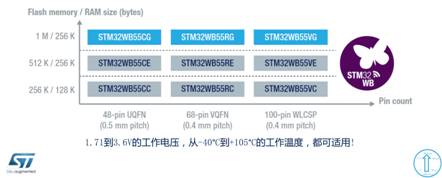 3.0和專有協(xié)議,1.71到3.6V的工作電壓,從-40℃到+105℃的工作溫度都可適用。STM32WB產(chǎn)品提供48引腳UQFN、68引腳VQFN或通用I/O(GPIO)達(dá)72口的100引腳WLCSP封裝,每款產(chǎn)品都可以指定三種存儲(chǔ)器組合中的任意一種:256KB Flash/128KB RAM、512KB-Flash/256KB-RAM或1MB-Flash/256KB-RAM。