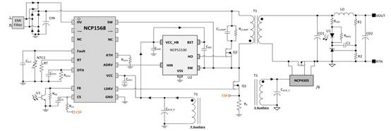 安森美半導體提供關鍵的硅器件用于有源鉗位反激(ACF)設計,包括NCP1568有源鉗位反激脈寬調制(PWM)控制器和NCP51530高性能高低邊MOSFET驅動器、NCP4306次級端同步整流驅動器,以及SUPERFET® MOSFET、橋式二極管、二極管等。這些可以組成一個系統方案。