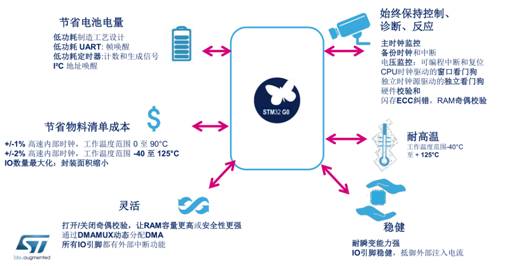 談到性能,他表示,與典型的入門級MCU相比,STM32G0高達64MHz的較大CPU頻率支持更高處理速度。另一方面,極其靈活的時鐘配置方案讓用戶能夠按照功率預算定制系統性能。內部時鐘穩定性極強,可與高端器件媲美,時鐘精度在0°C - 85°C范圍內為±1%,在-40°C-125°C范圍內為±2%,這不僅節省了連接專用外部定時器件所需的電路板空間和引腳,而且還降低了物料清單成本。
