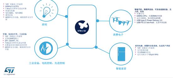 他較后總結道,STM32G0系列基于Arm Cortex-M0 +內核,在嚴格的功率預算內提供出色的性能,其封裝從8引腳到100引腳可選,開發人員可以輕松升級落后的8位MCU設計。閃存容量從16KB到512KB,512KB較小封裝是32引腳,開發人員能夠在小尺寸、低成本的產品上開發更復雜的應用。因此,STM32G0系列適用于物聯網世界中發展快速的產品,包括智能手機、智能廚房設備、家用電器、空調、消費產品或工業電機控制、高級用戶界面、物聯網設備、可充電聯網設備、無人機、照明系統等。
