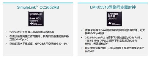 德州儀器推出的基于體聲波(BAW)的全新嵌入式處理器和模擬芯片非常適合應用在下一代無線物聯網和通信基礎設施的設計中。本次推出的采用TI BAW技術開發出的兩款器件分別是CC2652RB SimpleLink™無線微控制器(MCU)與LMK05318網絡同步器時鐘。它們將幫助系統設計師簡化設計邏輯,縮短產品上市時間,同時實現穩定、簡化和高性能的數據傳輸,從而可以降低潛在的整體開發和系統成本。