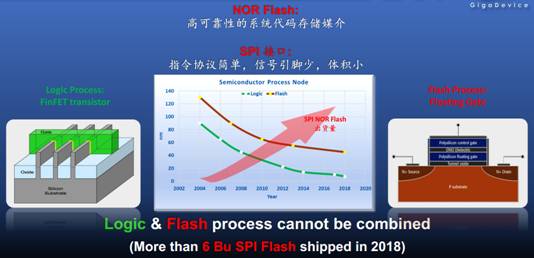 他解釋說,邏輯制程和Flash制程不能混合放在一顆芯片上,非常高深的這些制程或是很高級的邏輯芯片,很遺憾它不能同時附屬一個Flash,這時候需要一個外面的Flash支持它的代碼存儲。