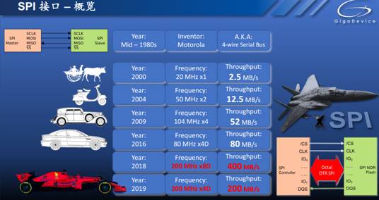 十年前SPI行業達到的標準是標準四通道SPI接口,直到十年后的今天,還有很多設計工程師,在用這個標準來進行他們的SPI的應用。這個時候數據吞吐量可以看到達到52MB/s,這時候兩個時鐘,通過四口可以得到一個數據data,所以這個時候基本上已經從兩輪變到四輪了,開始開汽車了。后來在四口的基礎上又進行了一些改進,有了DDR的概念,在四口的基礎上又加入了一個DTR的概念,在上升和下降沿都可以采集數據,這樣的話數據吞吐量可以達到80MB/s,這大概是從2015、2016年開始逐漸實現的。當然它還是一部汽車,只是比剛才那輛會跑得更快一些。