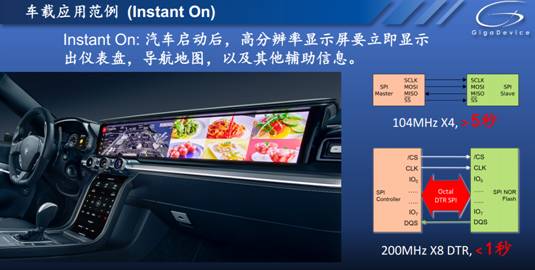 那么,在應用端如何讓新的SPI Flash使你的應用能夠受益呢?陳暉主要從車載、AI和IoT熱點應用來講,不管是AI、5G或車載、IoT,都希望產品性能越來越好、越來越快。很新的車采用超大的顯示屏,它直接涉及到SPI NOR Flash的應用。如果用前一代104MHz四口來存儲所有顯示屏的數據,把顯示屏里面的數據從Flash里面讀出來,需要超過五秒鐘。如果用較新的八口協議,用200MHz DTR來讀,不到一秒鐘時間這么大的屏幕就會點亮,這個速度才能滿足人的需求。
