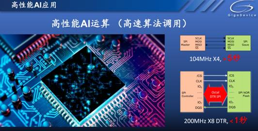 AI非常復雜,一會經常要調用不同的算法,從數據庫里進行各種比對。所以作為Flash會支持它的操作,這樣看它不光是有存儲的系統代碼,同樣也會存儲算法和一個大的數據庫。但這并不需要一上電就把所有的算法或數據庫都加載到系統里面,在需要的時候才會從flash臨時來調用,所以就要求flash提供一個高的數據吞吐率。同樣的對比,8口高性能的xSPI能讓系統響應非常迅速,真正實現AI功能。