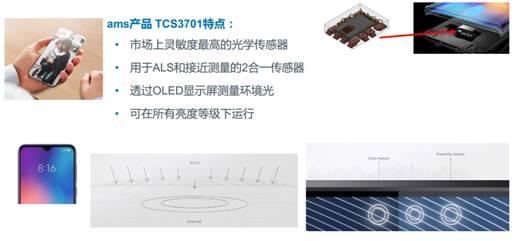 智能手機第二個趨勢是全屏化。在全屏方面,艾邁斯有一款支持全屏的屏下設計傳感器TCS3701。它的靈敏度要很高,光可以通過OLED屏下面打出來,可以在所有亮度等級下運行,這個產品現在已經量產。