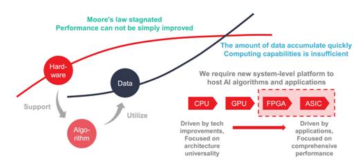 他介紹說,計算芯片工藝從過去28納米、20納米、16納米、14納米、10納米、7納米、5納米、3納米,摩爾定律使芯片性能增加速度越來越飽和。大家看到技術的趨勢只有高端的消費類、迭代很快的產品(例如手機)才能支撐得起較先進工藝高昂的芯片迭代成本。至于芯片的發展趨勢,無論從CPU、GPU到FPGA、ASIC,對于通用芯片來講,它的好處是應用比較廣泛、上手比較快,眾多創業公司都在做各種各樣的ASIC,希望在特定的定制領域提供一些場景和應用。對這些特定的場景和應用,ASIC的性價比可能更高,所以技術發展的趨勢一定是從CPU、GPU到FPGA,較后到ASIC。所以在市場上有一個很重要的時間窗口,就是每個行業在需求成熟之前,在大家有能力、有信心去開ASIC把這個錢賺回來之前,大家不會去開ASIC,而且這時候又需要一個平臺做初期的市場嘗試或者在激烈的市場競爭中快速將創意變成現實,贏得市場先機,這時候FPGA就是較好的計算平臺產品。
