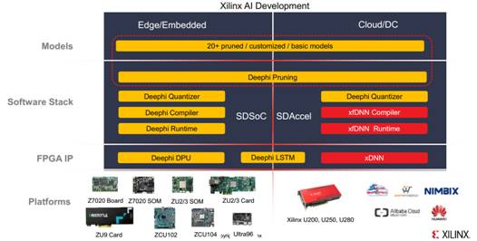 在人工智能方面,賽靈思為客戶提供端到端的解決方案,為客戶提供不同層次的支持,從底層的硬件、中間各種各樣的IP以及軟件,應用層各種各樣的神經網絡模型,都可以提供給客戶。客戶可以選擇其不同的神經網絡,選擇合適的芯片、合適的硬件。這些PCB的板卡都比較成熟,無論是賽靈思及合作伙伴、客戶都有能力做這些硬件。結合賽靈思傳統的開發軟件,把這些整套的AI相應的工具用起來,就可以快速地實現產品的部署。