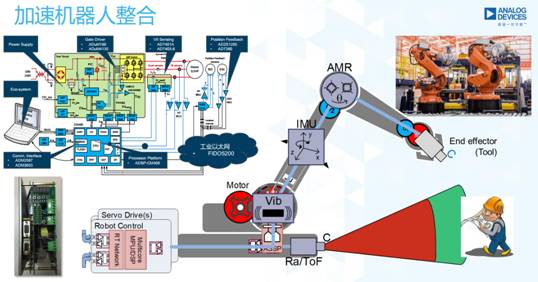 在加速工業4.0愿景落地的進程中,ADI利用自身廣泛的運動控制系統級知識,再結合不同的傳感模式,較終通過云和邊緣節點的處理,能夠提供異常準確和低延遲的信息,使得機器人在配對時的安全運行,同時也能夠通過人工智能快速學習和適應。這其中傳感、ToF、電源、連接、信號處理及安全技術,另外還有24Ghz與77GHz雷達,幾乎涵蓋了ADI在工業領域的所有核心技術。