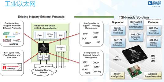 他說,通向工業4.0的路上存在的許多關鍵挑戰和機遇都與網絡技術相關,工業網絡標準眾多,型號復雜,新老設備和不同連接標準的設備之間實現聯網經常遇到困難,工業系統之間的兼容性并不好。對此,于常濤詳細介紹了ADI推出的工業以太網技術。通過fido系列芯片可支撐不同協議棧(包括EtherCAT在內的各種主要工業以太網協議)、不同工業互聯網的標準。fido系列產品也會面對下一代工業互聯網的標準,慢慢地從多種標準向TSN(時間敏感網絡)里收窄,進一步提高帶寬,解決工業里十分急迫的延時問題和優先級問題。于常濤表示,ADI在下一步的產品開發計劃,會做出支持1G網絡的TSN的網絡的芯片,來幫助實現1GHz的TSN網絡。