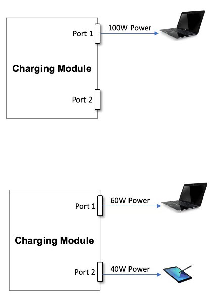 Type-C端口的功率降低至60W,而第二個(gè)插入的設(shè)備可以獲得40W功率(參見圖2)。