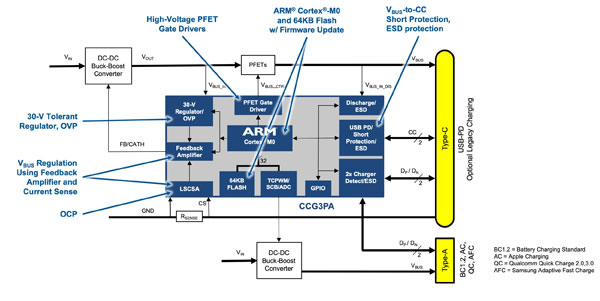 Type-C控制器,比如這里顯示的賽普拉斯CCG3PA,通過集成必要組件,確保高可靠供電、降低成本、簡化設(shè)計(jì),同時(shí)在車輛的使用壽命中保持良好的互操作性。
