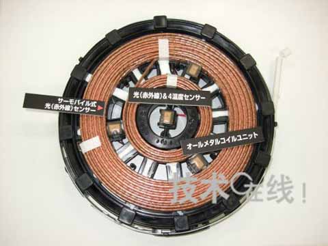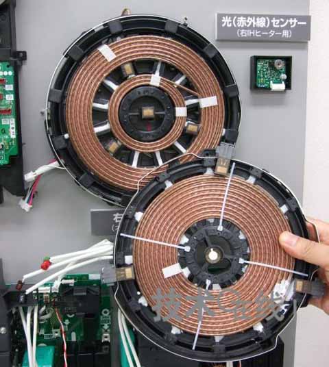 此次的新系列為改變光傳感器的設置位置而改變了線圈的形狀。以前,線圈從上面看如油炸圈餅狀,而新系列改成了類似大油炸圈餅的圈內加入小油炸圈餅的形狀。光傳感器就設置在這兩個圈之間離中央50mm的位置上。這樣一來,便可對線圈正上方達到較高熱度的部分進行準確的溫度檢測,即使急速加熱也不易發生問題。