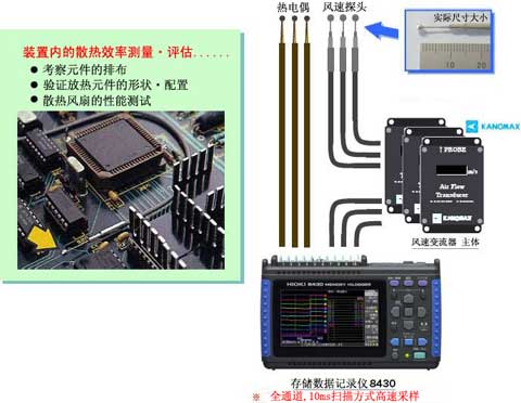 比如在進行裝置內的散熱效率評估時,溫度的測量是必不可少的,而風速也是一個重要的測量因素。將手持式10通道版存儲記錄儀 8430-21和熱電偶、風速變流器結合使用,風速・溫度的多通道測量就成為可能。圖例如下:
