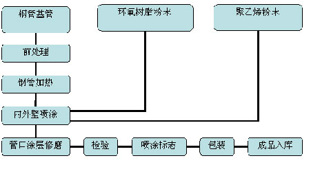 鋼管除油—噴砂處理—焊縫修磨—中頻加熱鋼管—內表面噴涂環氧樹脂粉末/外表面噴涂聚乙烯粉末—管口涂層修磨—檢驗—包裝—入庫