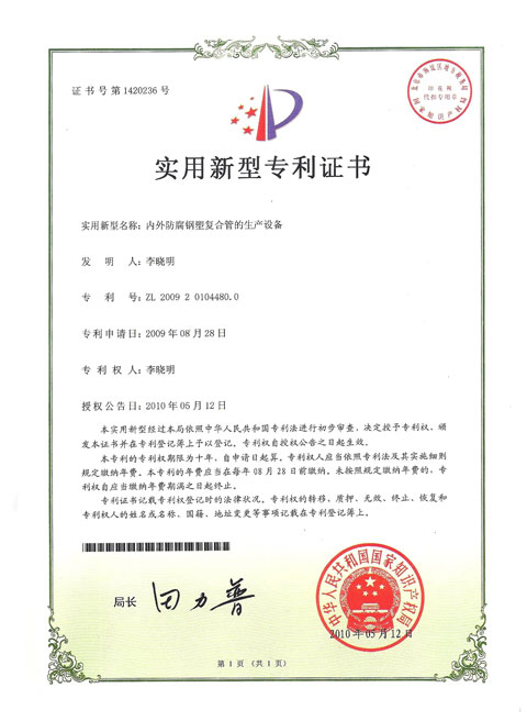 當向我們介紹起這項專利技術時,李曉明就像談起了自己的孩子一樣,娓娓道來了它從孕育,到誕生,到成長的這一系列過程。早在六年前,李曉明在一次會議上,偶然得知了國外的防腐管道行業已經有了一項生產復合管道的新技術,這項技術不但大大提高了該國防腐管道的質量和使用壽命,更節約下了大量的可貴資源?磥,已經有人先于我們邁出了一步。別人能有,我們為什么不能有呢?抱著這樣的信念,李曉明開始潛心研究大口徑內外防腐鋼塑復合管的生產技術。功夫不負有心人,這項技術在六年后的今天研制成功,并獲得了國家知識產權局授予的專利證書。目前,該技術已經轉化為了實實在在的設備,
